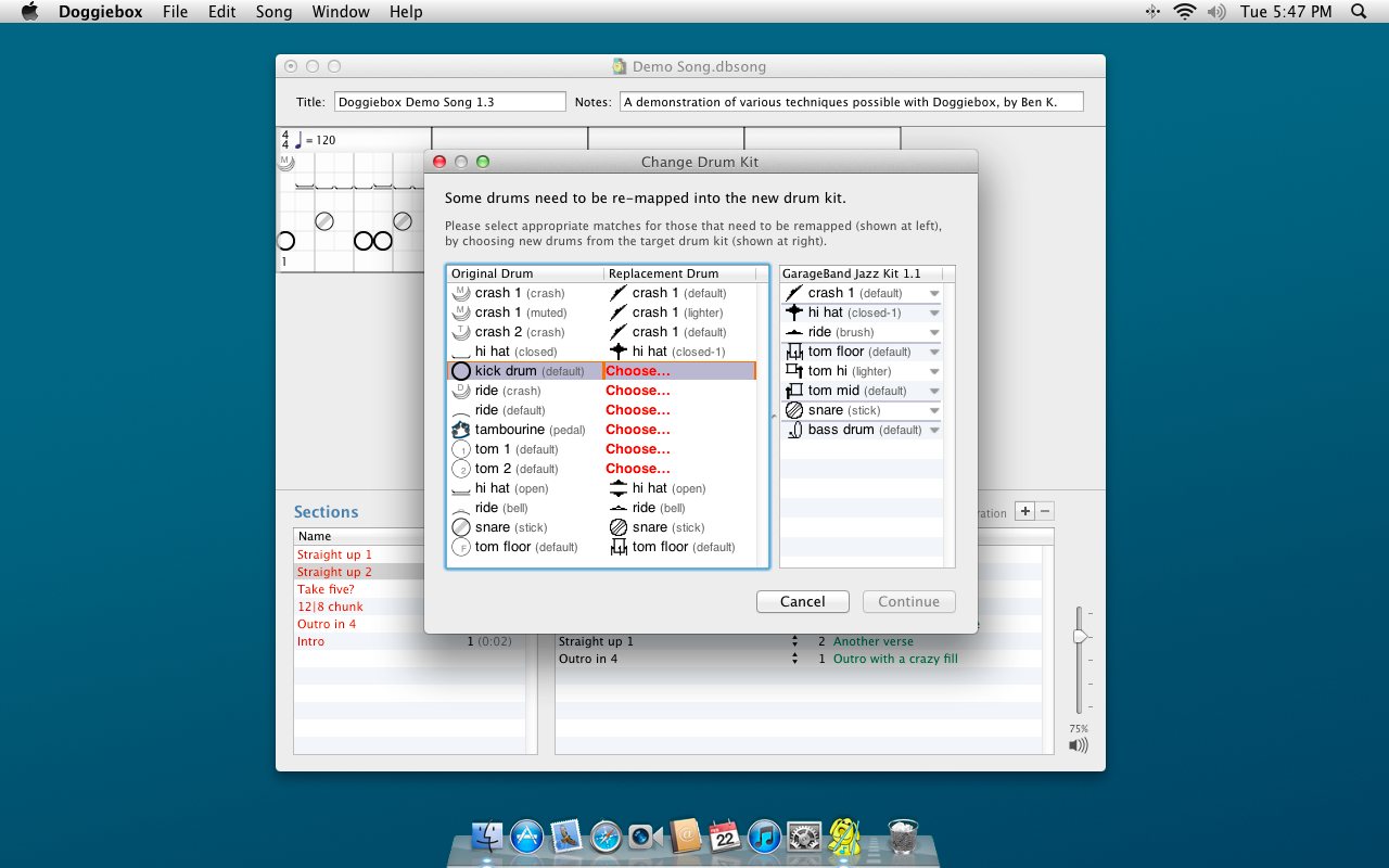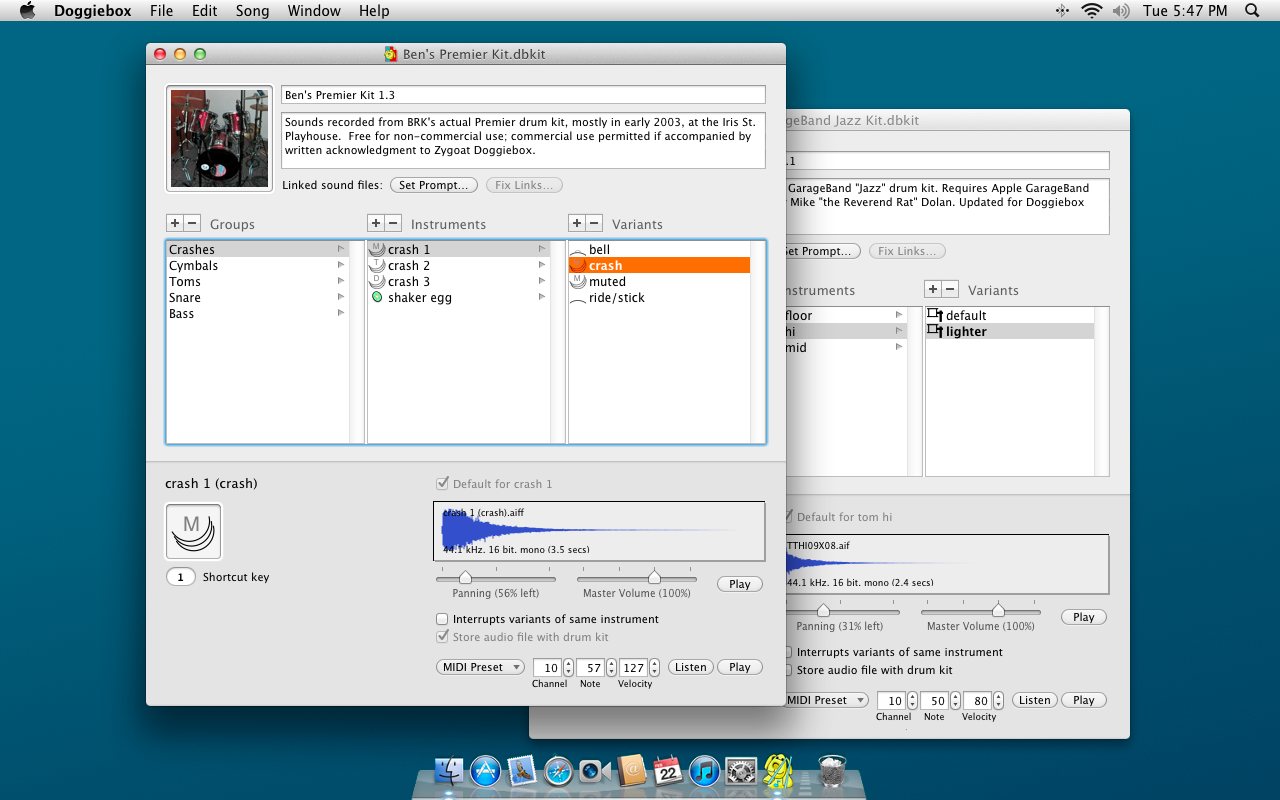 Doggiebox comes with several pre-configured drum kits representing a variety of styles and sounds. All aspects are adjustable, including the instrument names, key shortcuts, graphical icons, and of course the drum sounds themselves.